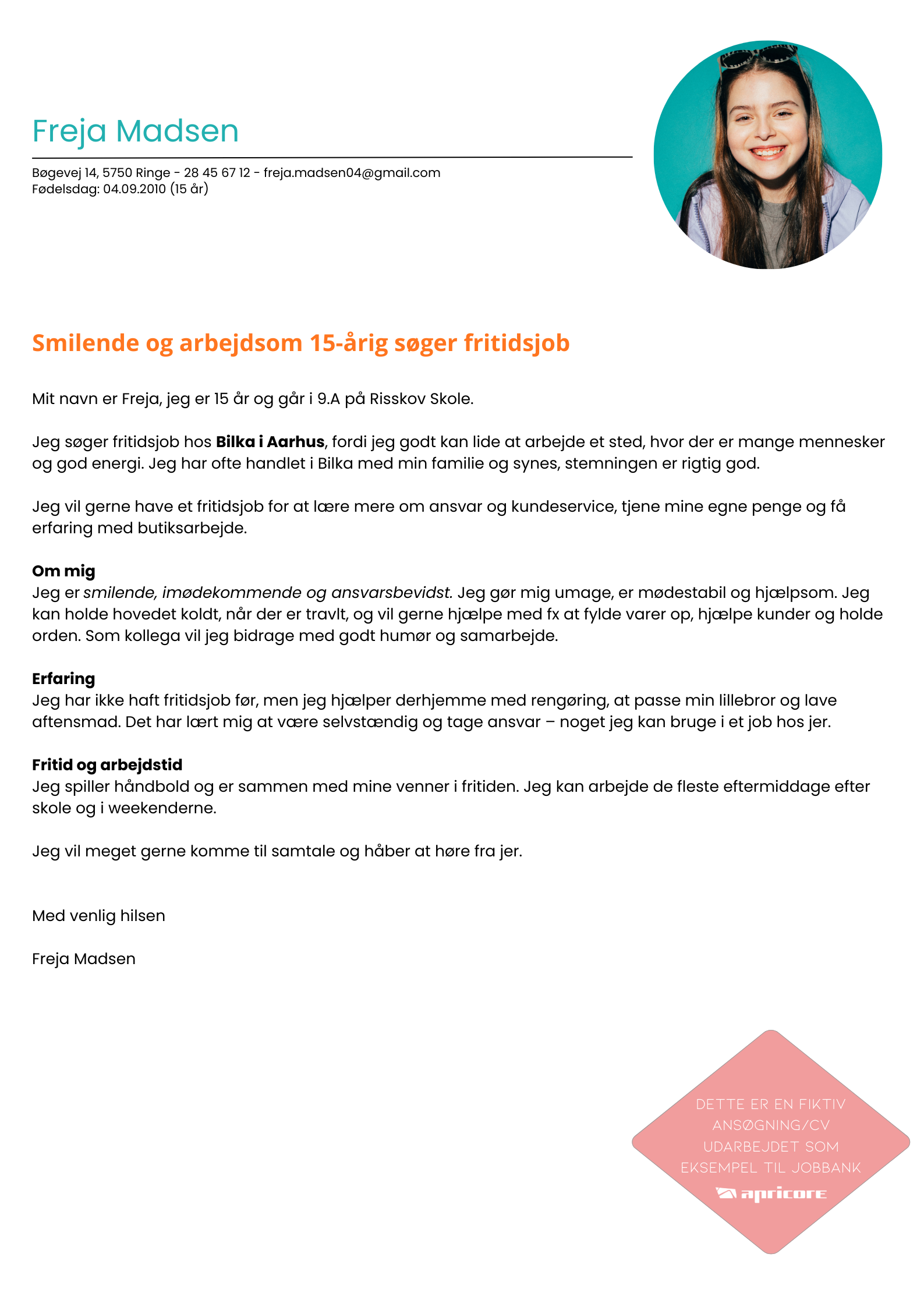 Billede: ANSØGNING eksempel - Freja 15 år, uden erfaring
